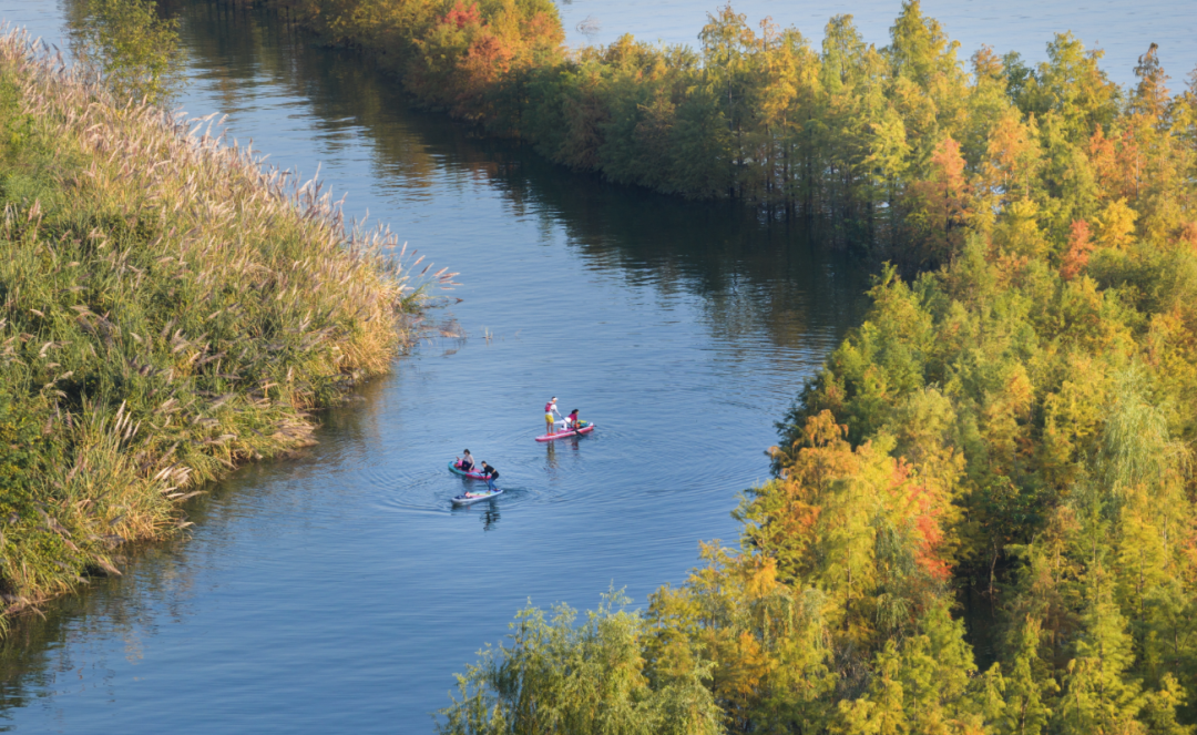 开州区汉丰湖国家湿地公园层林尽染,游客划着桨板穿梭在水上彩林间,仿佛进入梦幻般的油画世界。(资料图片)特约摄影 王晓宇