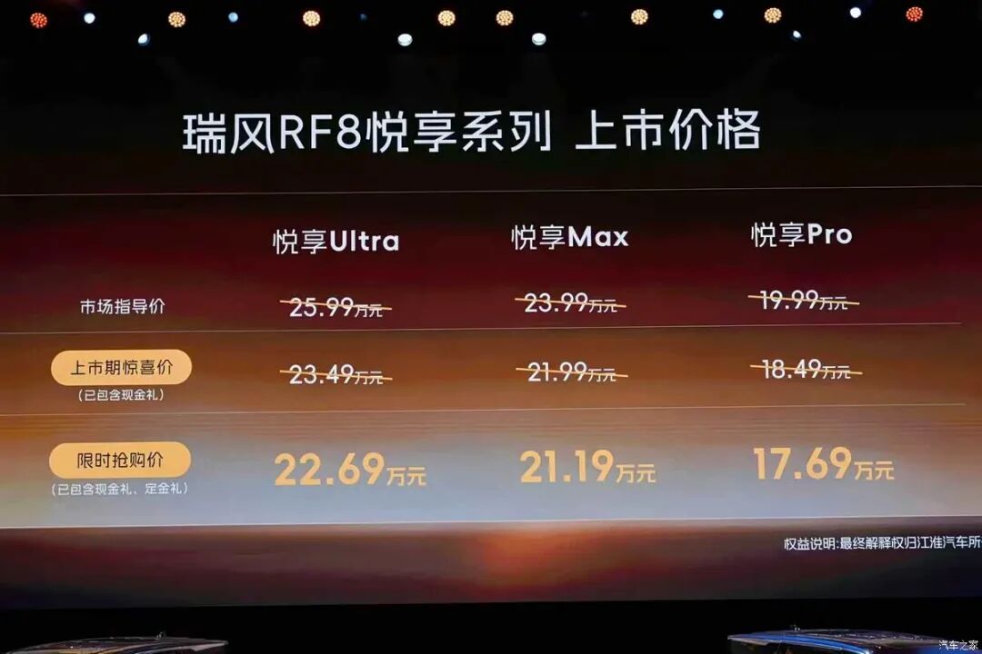 瑞风RF8悦享系列迎来正式上市,新车共推出3款车型,售价区间为19.99-25.99万元,限时抢购价17.69-22.69。车辆定位为中大型MPV,搭载插电式混合动力系统,CLTC纯电续航里程150km,综合续航1150km。
