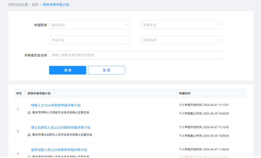 本次申报实行网上申报,登录重庆市专业技术人员服务平台后,进入职称版块的个人中心,在“职称评审(原职称申报)”栏选择相应的认定委员会进行申报。所有申报表格和佐证材料,均在网上填写和上传。