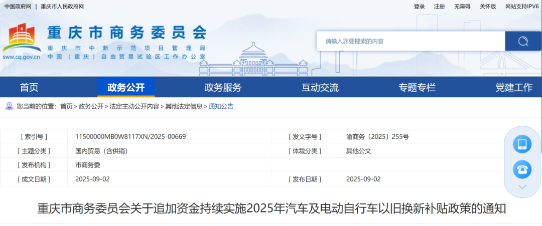 汽车报废更新、汽车置换更新、电动自行车以旧换新政策的有效申报周期或时间分别自10月1日10:00、9:00、9:00开始至当月额度申报完毕即停止受理,补贴标准、相关要求分别与渝商务〔2025〕201号、渝商务〔2025〕239号、渝商务〔2025〕240号文件规定保持一致。