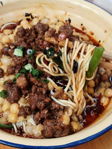 细细沙沙的耙豌豆配上超级大颗的杂酱,
