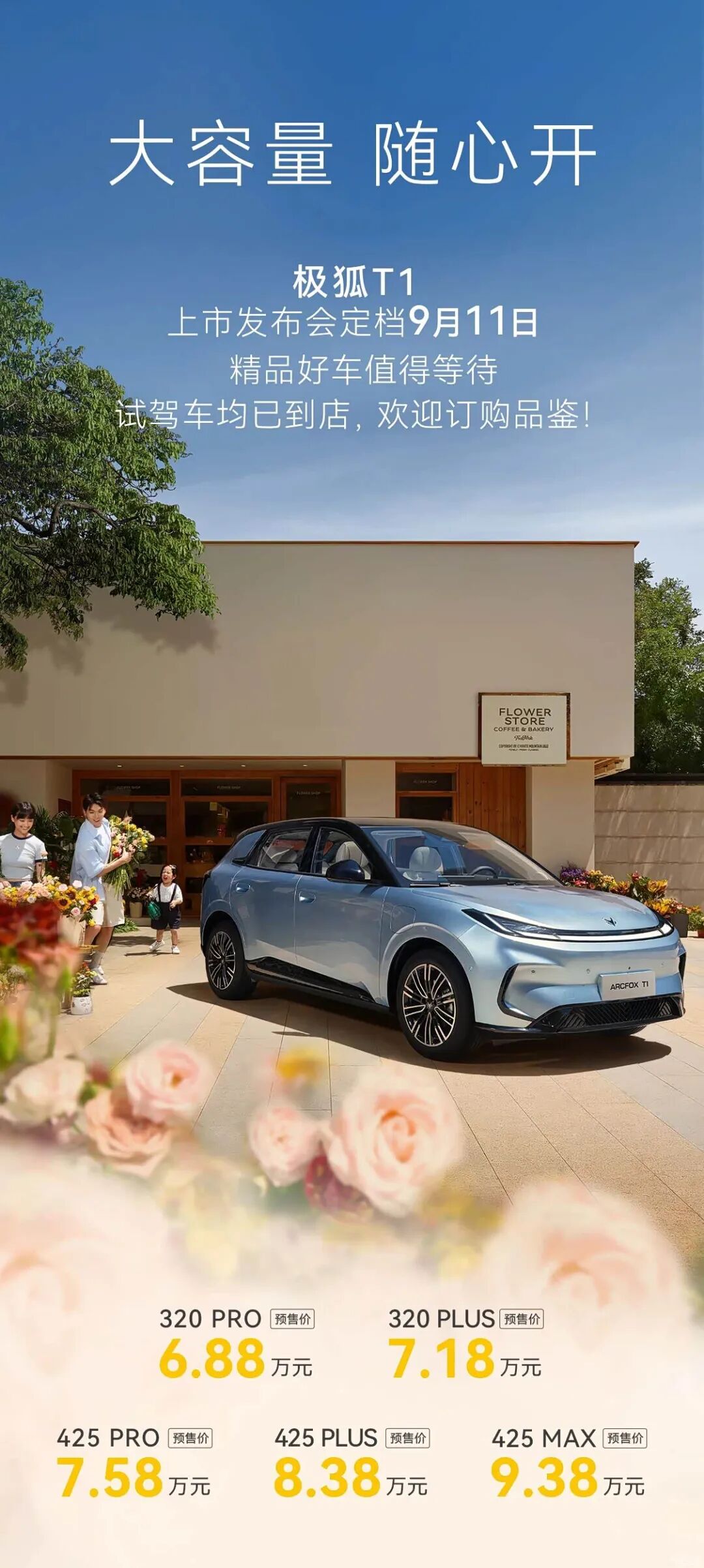 日前,我们从官方获悉,极狐T1于9月11日正式上市,该车此前已经开启预售,共推出5款车型,预售价区间为6.88-9.38万元,425km续航车型上市即交付,320km续航车型10月中旬开启交付。极狐T1是一款纯电动小型车,采用了极狐品牌最新的设计理念,并且主打车内大空间,最大续航425公里。