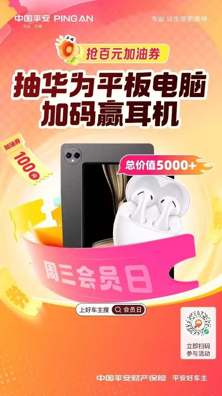 平安好车主 | 搜会员日,抢百元加油券,抽华为平板电脑,加码赢耳机