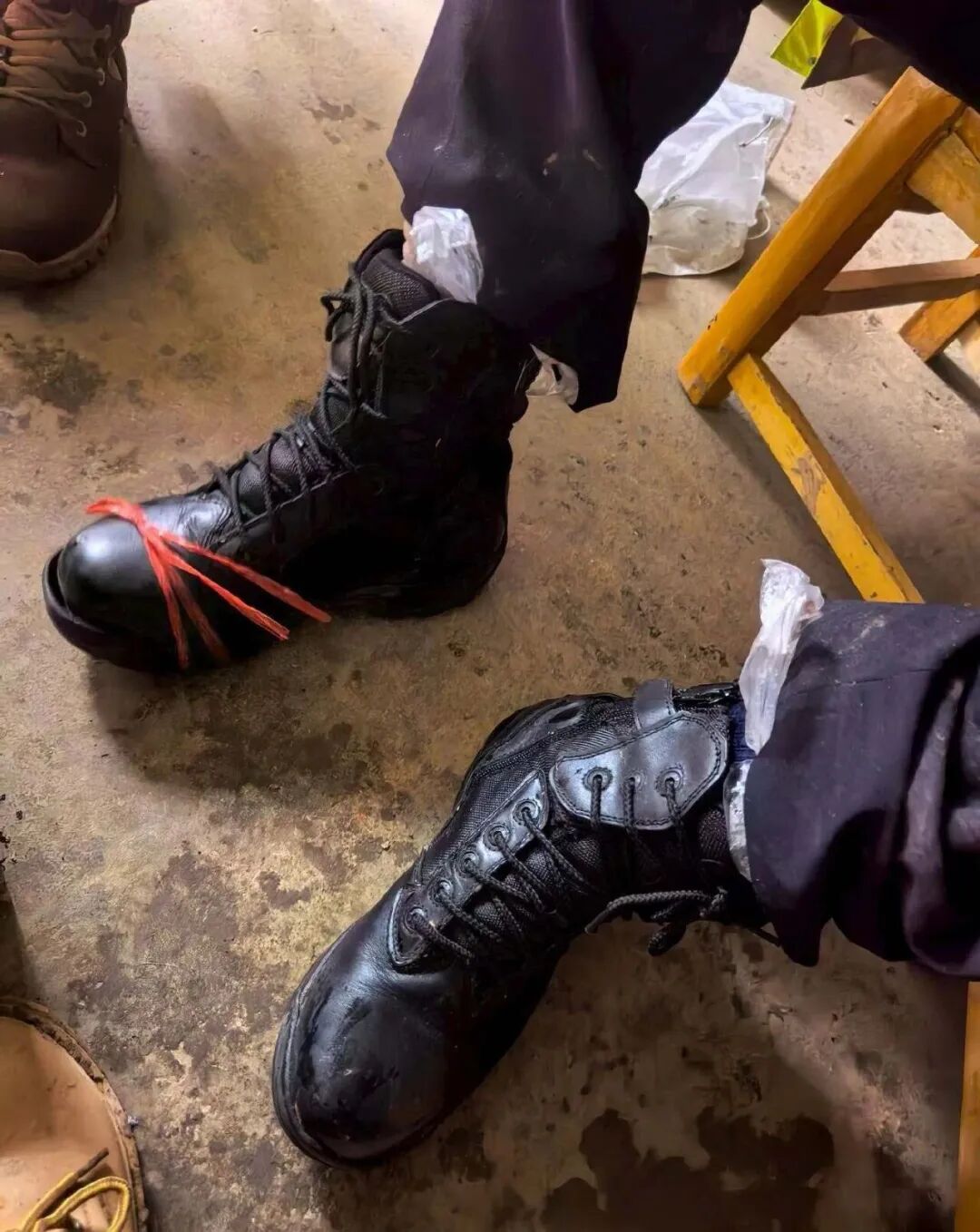 雨雪天气持续,民警浑身湿透,滑倒再爬起来;鞋子破了,就用绳子绑起来;裤子湿了,就用塑料口袋隔着,继续投入搜救工作。